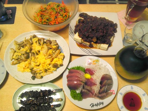 本日のメニューは、中華クラゲ、カツオの刺身、ウナギの肝焼き、シメジ玉子炒め、豆腐の味噌ナス、です。