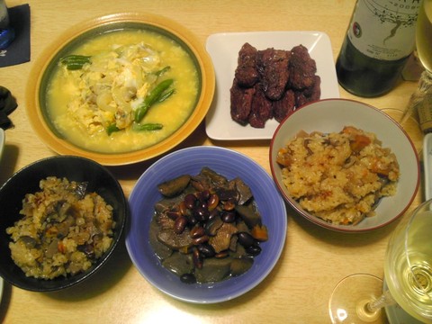 中華クラゲ、シメジ玉子炒め、豆腐の味噌ナス、他