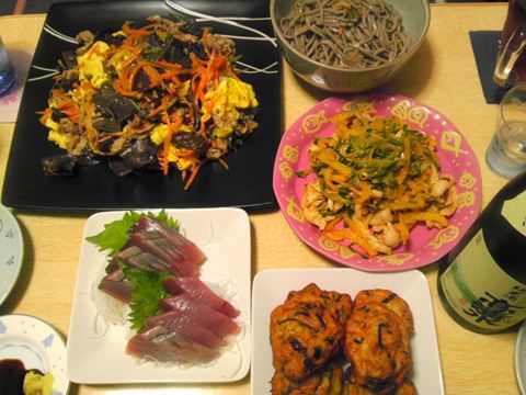 本日のメニューは、豚肉とキクラゲとにんじんの玉子炒め、鶏皮とキュウリとパプリカのポン酢和え、蕎麦のめかぶ和え、カツオの刺身、さつま揚げ、です。