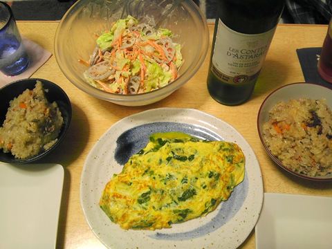 本日のメニューは、中華おこわ、ほうれん草のチーズオムレツ、ゆで豚のサラダ、です。
