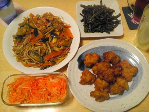 本日のメニューは、麻婆茄子、ゼンマイのきんぴら、鶏の唐揚げ、にんじんと大根のナムル、です。