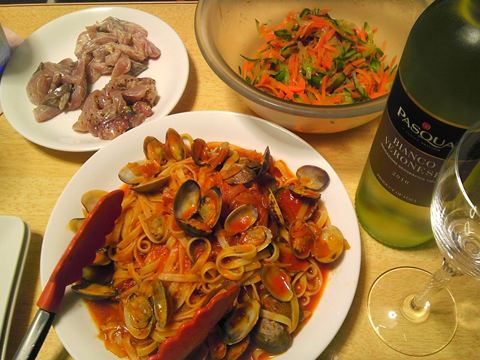 本日のメニューは、ボンゴレロッソ、イナダのイタリアンユッケ、中華くらげのサラダ、です。