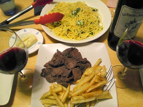 本日のメニューは、牛肉のワイン焼き、ポテトフライ、にんじんの葉とペコリーノロマーノのパスタ、です。