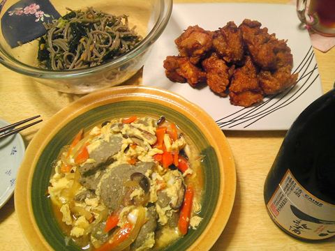 本日のメニューは、鶏の唐揚げ、イワシつみれの玉子とじ、ソバの和え物、です。