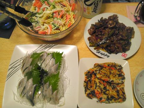 本日のメニューは、イワシの刺身、砂肝とナスの味噌炒め、マカロニサラダ、さつま焼き、です。