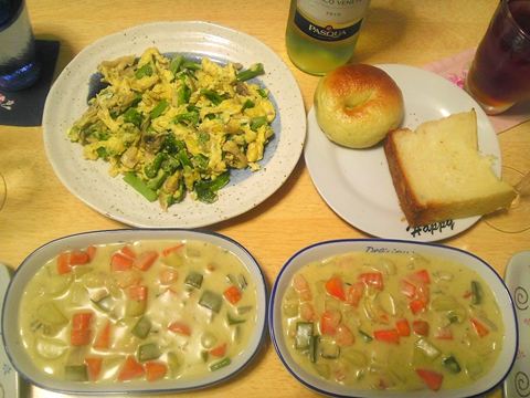 本日のメニューは、クラムチャウダー、舞茸とブロッコリーの玉子炒め、手作りパン、です。