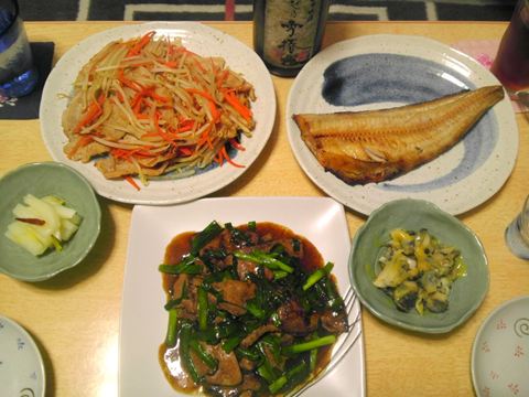 レバニラ、ホッケ焼き、トントロとにんじんモヤシ炒め、ほか