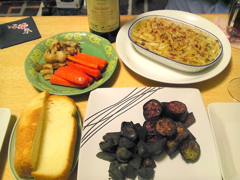 本日のメニューは、ナスと塩レバーのワインソテー、ヤンソンさんの誘惑、手作り食パン、鶏皮とにんじんのソテー、です。