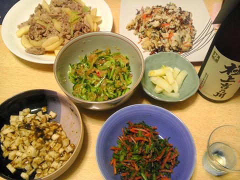 本日のメニューは、豚肉とゆず大根炒め、さつま揚げ、にんじんとにんじん葉のゴマ和え、中華クラゲ、山芋の海苔和え、です。