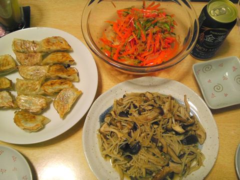本日のメニューは、餃子、キノコ炒め、中華クラゲにんじん増量、です。
