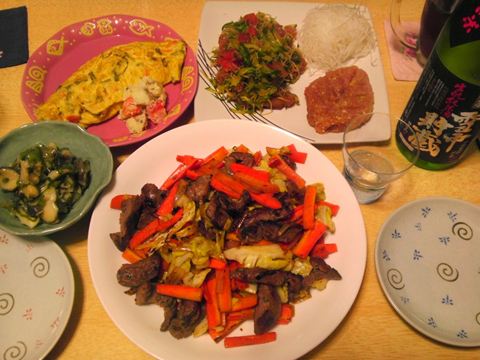 本日のメニューは、豚のサガリと野菜炒め、マグロとサーモンのユッケ、マグロのなめろう、セロリとニンジンのオムレツ、貝のわさび合え、です。