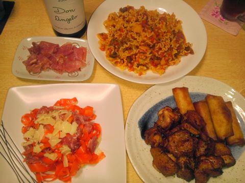 本日のメニューは、鳥のから揚げ、チーズ春巻き、にんじんと生ハムのチーズサラダ、ショートレジネッテのトマトソースがけ、生ハム、です。