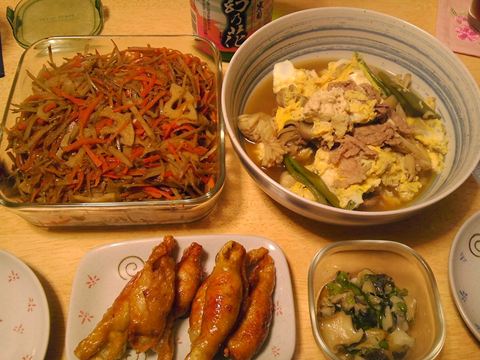 本日のメニューは、きんぴらごぼう、舞茸入り肉豆腐、鶏皮餃子、です。