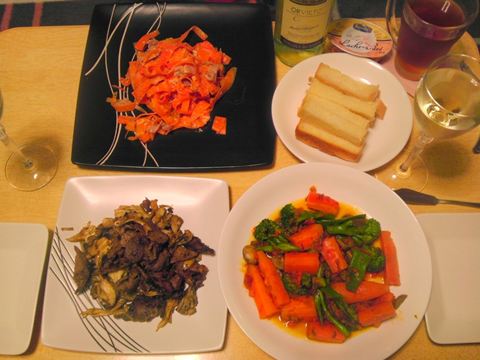 本日のメニューは、牛肉と舞茸のソテー、野菜のトマトソース煮、生ハムとニンジンのチーズサラダ、手作りパンとサーモンパテ、です。