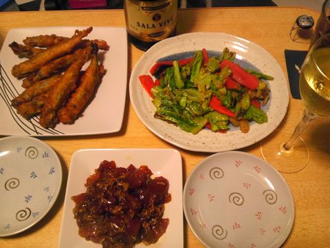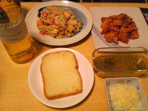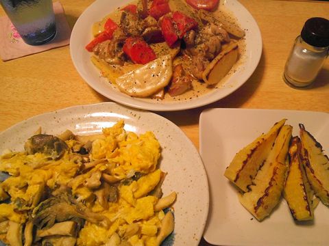本日のメニューは、焼きタケノコ、タケノコと鶏肉とニンジンのクリーム煮、あわび茸の卵炒め、です。