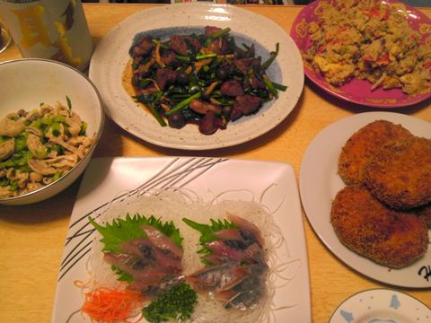 本日のメニューは、レバニラ、酢モツ、おからコロッケ、アジの刺身、です。