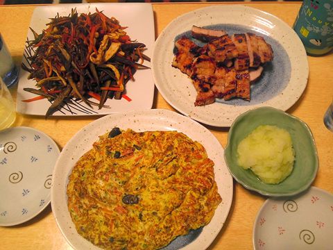 切り干し大根と切り干しごぼうのキンピラ、豚肉の塩麹漬け焼き、ヒラタケとにんじんの卵焼き