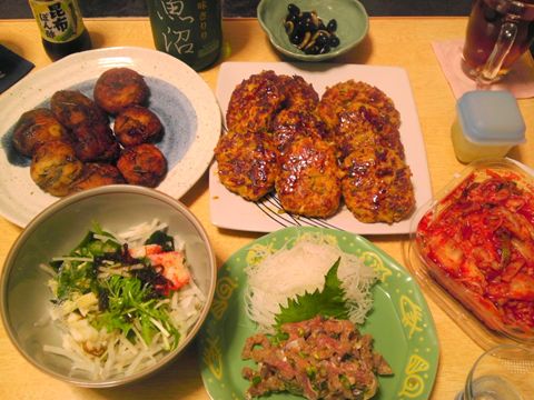 本日のメニューは、はんぺん揚げ、鶏のつくね、アジのタタキ、ひたし豆、あとは惣菜コーナーで買ってきた大根サラダです。