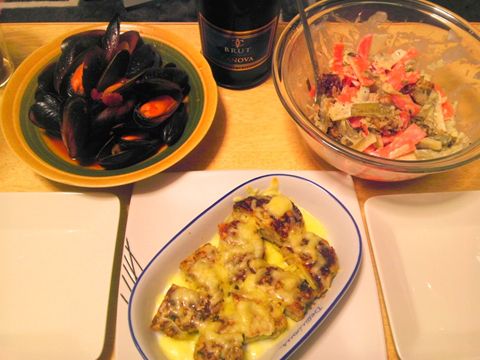 本日のメニューは、ムール貝のトマトソース煮込み、鶏つくねのチーズ焼き、ヤーコンとニンジンのはんぺんサラダ、です。