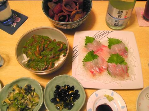本日のメニューは、ナメコめかぶ山芋の和え物、ひたし豆、ホウボウの刺身、貝のワサビ漬け、イカと里芋の煮物、です。
