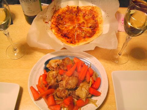 本日のメニューは、チーズピザ、鶏肉とニンジンのソテー、です。