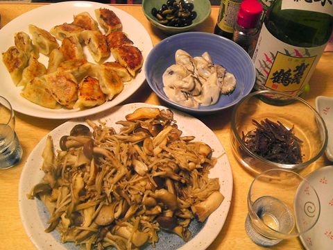 本日のメニューは、きのこソテー、餃子、酢ガキ、煮干しの佃煮、です。