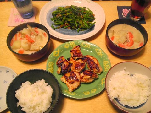 本日のメニューは、鶏肉の塩麹焼き、ほうれん草のナッツ炒め、粕汁、です。