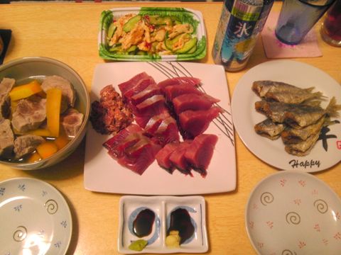 本日のメニューは、ブリとカツオの刺身、にんじんと豚バラ煮、アジの唐揚げ、です。