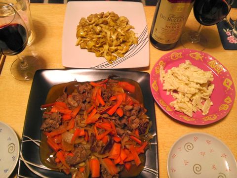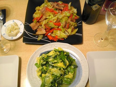 ホイコーロー、卵とチーズとほうれん草炒め
