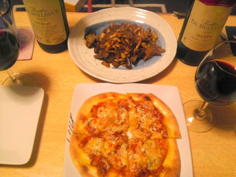 本日のメニューは、ピザ、タモギ茸と塩レバーのバルサミコ炒め、です。