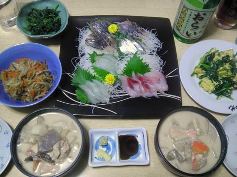 本日のメニューは、刺身盛り合わせ(アジ、ひらめ、メダイ)、粕汁、切り干し大根の煮物、ほうれん草のゴマ和え、ほうれん草の玉子炒め、です。