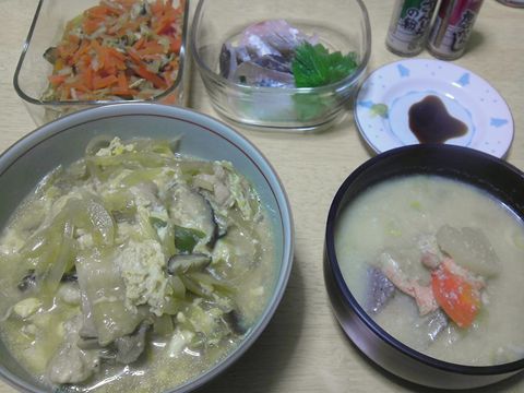 粕汁には鮭が入っています。粕汁は体があったまりますね~。でも刺身で体が冷えます・・・(ノ_< ;)