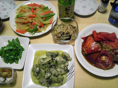 本日のメニューは、キンメダイの煮付け、牡蠣のバター炒め、ジャガイモとにんじんとサヤインゲンの炒め物、モヤシのナムル、です。