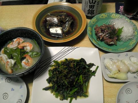 本日のメニューは、サンマの煮付け、ほうれん草のつくだ煮炒め、エビとキヌサヤのくず煮、アジのたたき、マツブ貝のにぎり、です。