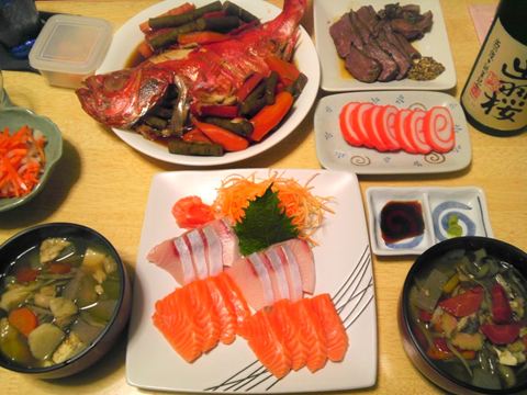 金目の煮付け、刺身、ローストビーフ、雑煮、富山のかまぼこ、です。