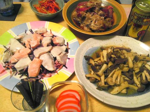 本日のメニューは、きのことローストビーフのマスタード炒め、にんじんとブリとサーモンのシーザー風サラダ、なますのゴマ和え、昨日の残りの金目の煮付け、です。