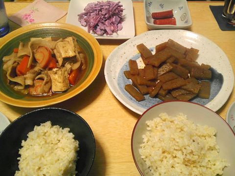 本日のメニューは、コンニャクの雷炒め、にんじんと豚肉の味噌煮、昨日の残りのサラダです。