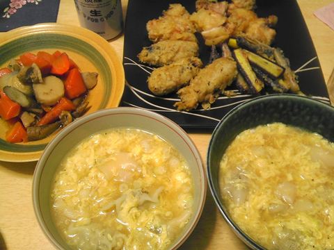 本日のメニューは、鶏肉の天ぷら、にんじんの里芋巻揚げ、にんじんの天ぷら、サンラータン餃子、筑前煮、です。