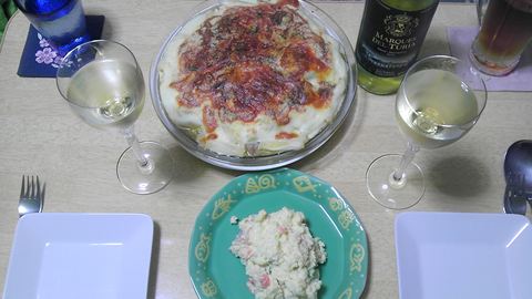 本日のメニューは、エビマカロニグラタン、ポテトサラダ、です。