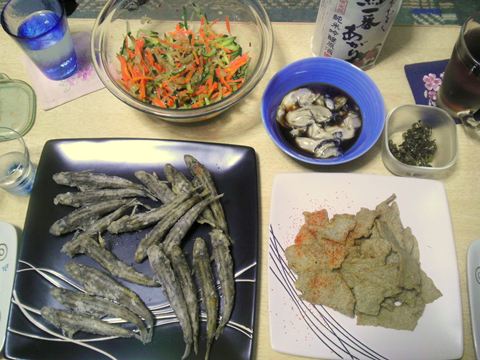 本日のメニューは、メヒカリの唐揚げ、中華くらげのサラダ、じゃこ天、生牡蠣、です。