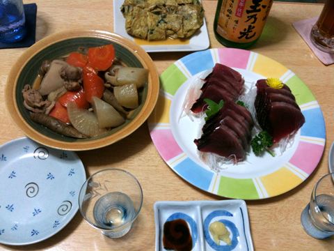 本日のメニューは、筑前煮、カツオの刺身、卵焼き、です。
