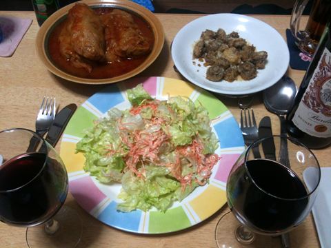 本日のメニューは、ロールキャベツ、シーザーサラダ、マッシュルームのパン粉焼き、です。