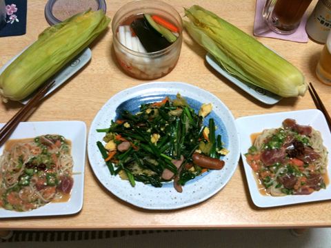 本日のメニューはトウモロコシ、ニラと空芯菜の炒め物、ゴマだれ海鮮冷や麦、です。