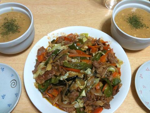 本日のメニューはカルビ野菜炒め、イタリアン冷製スープ、です。