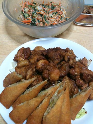 本日のメニューはトリの唐揚げ、春巻き、ニンジンのしりしりサラダ、です。