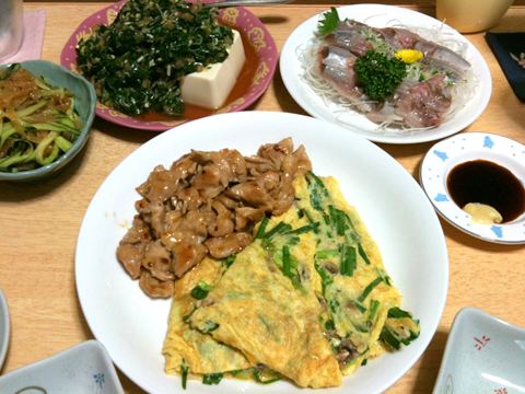 本日のメニューはニラ玉、鶏のハラミの焼肉、モロヘイヤ乗せ冷や奴、銚子産イワシの刺身、中華クラゲとキュウリの和え物、です。