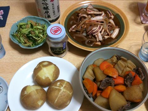 本日のメニューはカツオの塩辛とジャガバター、いかごろ炒め、砂肝と根菜の煮っころがし、きゅうりと中華くらげの和え物です。