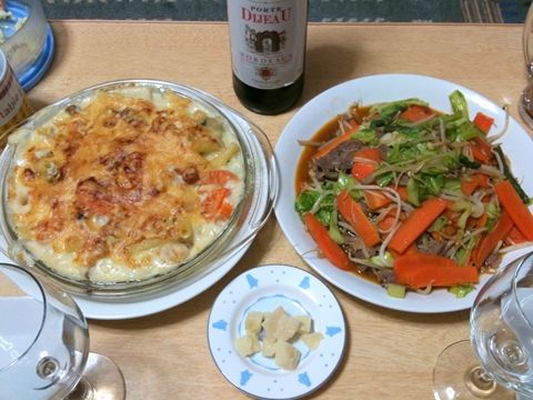 あつあつのマカロニグラタンと、ラム肉を使った野菜たっぷりのジンギスカンです。