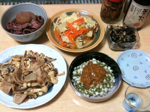えー、左上がイカ大根、その下が豚トロとキノコ炒め、真ん中上がコウヤ豆腐の深川風(アサリと味噌で味をつけたもの)、その下が山芋とメカブとナメタケの和え物、右側にあるのは松前漬けとワカサギの佃煮です。