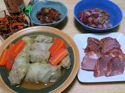 ロールキャベツ、松前漬け、まぐろ納豆、焼き豚